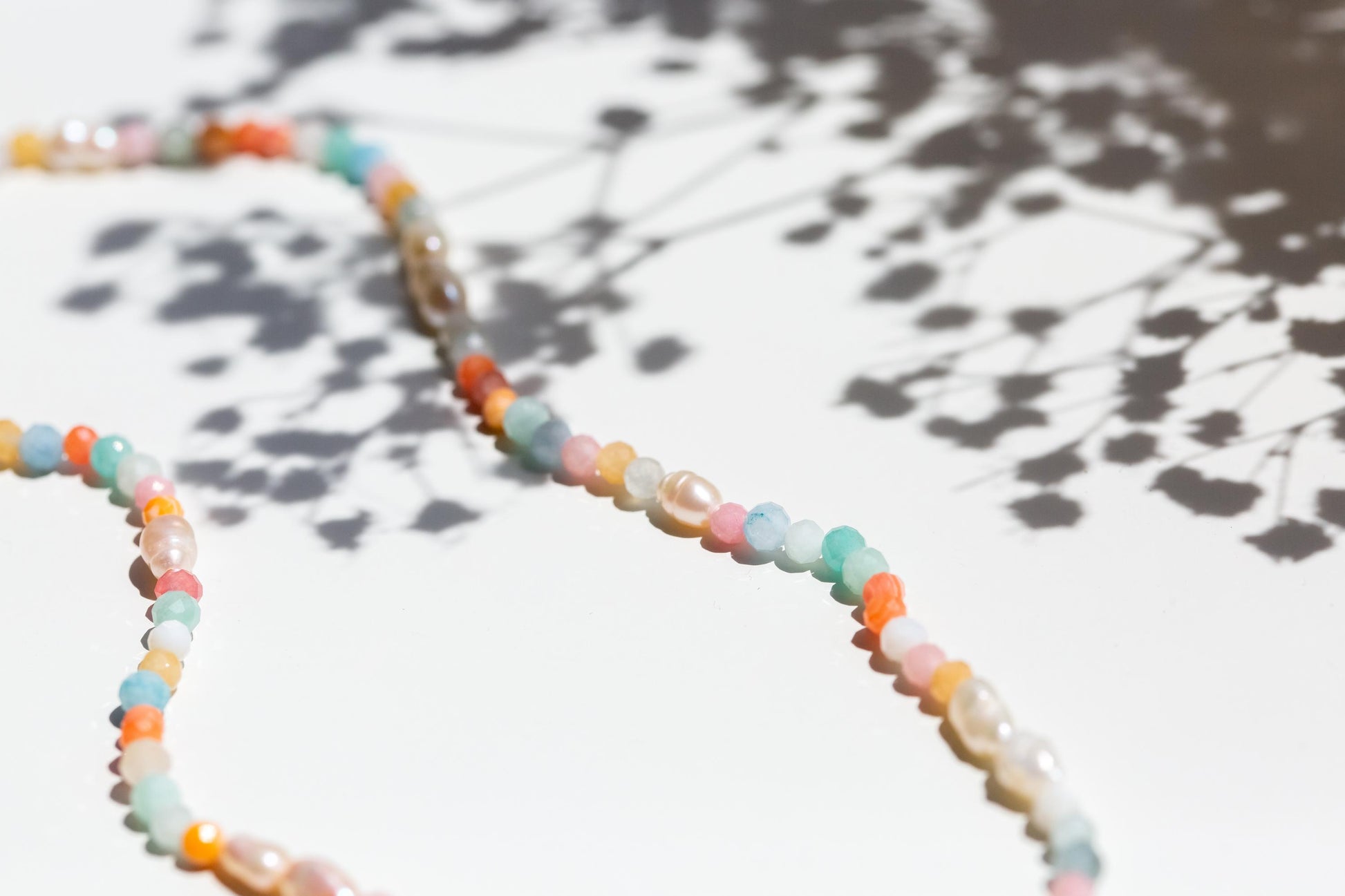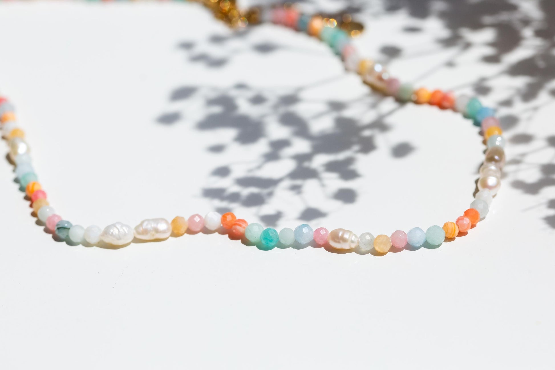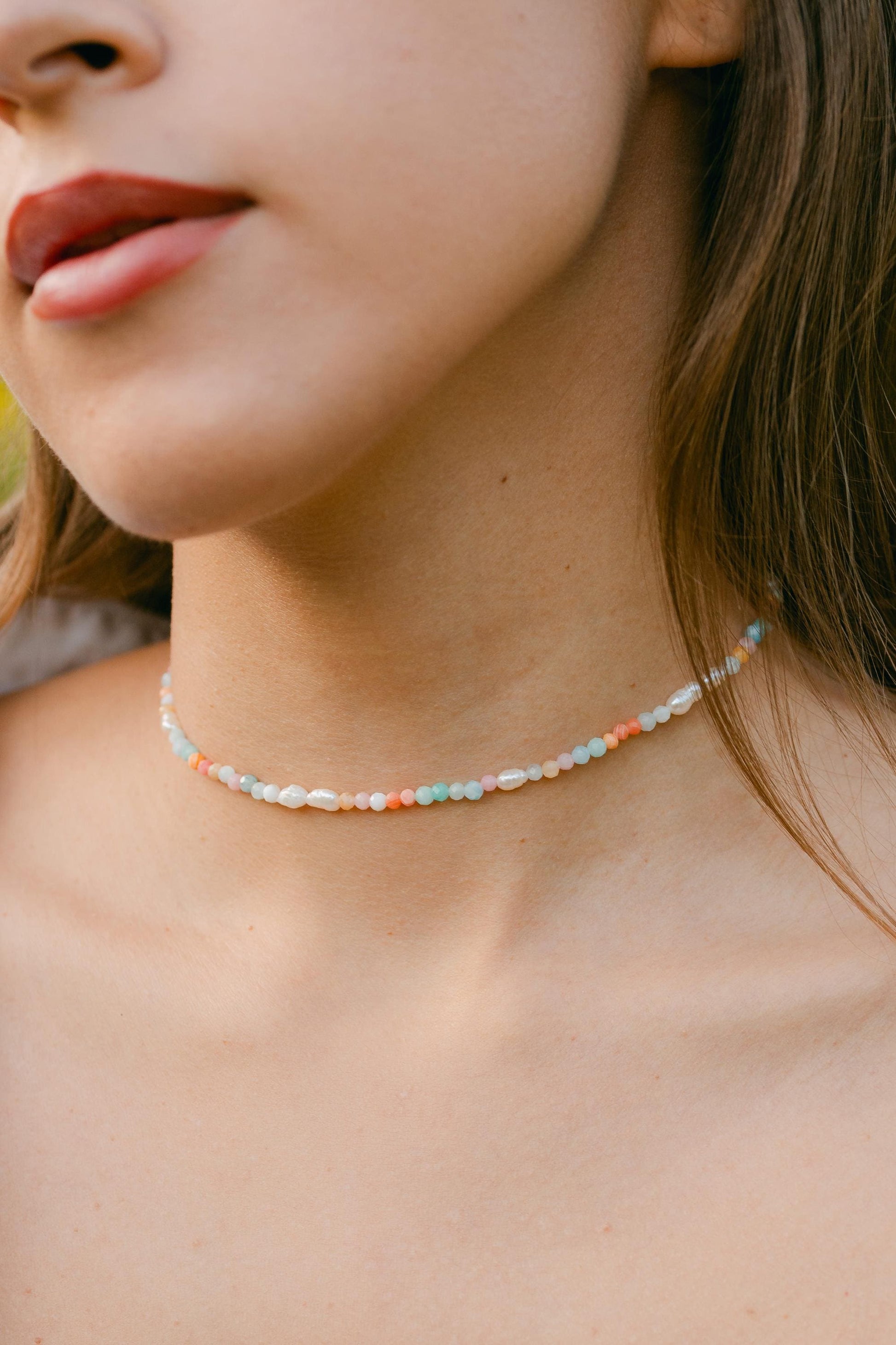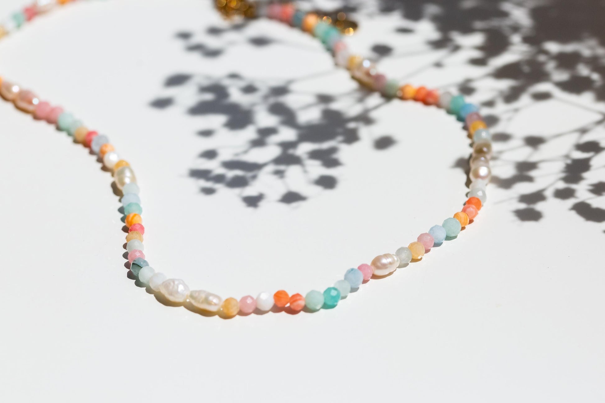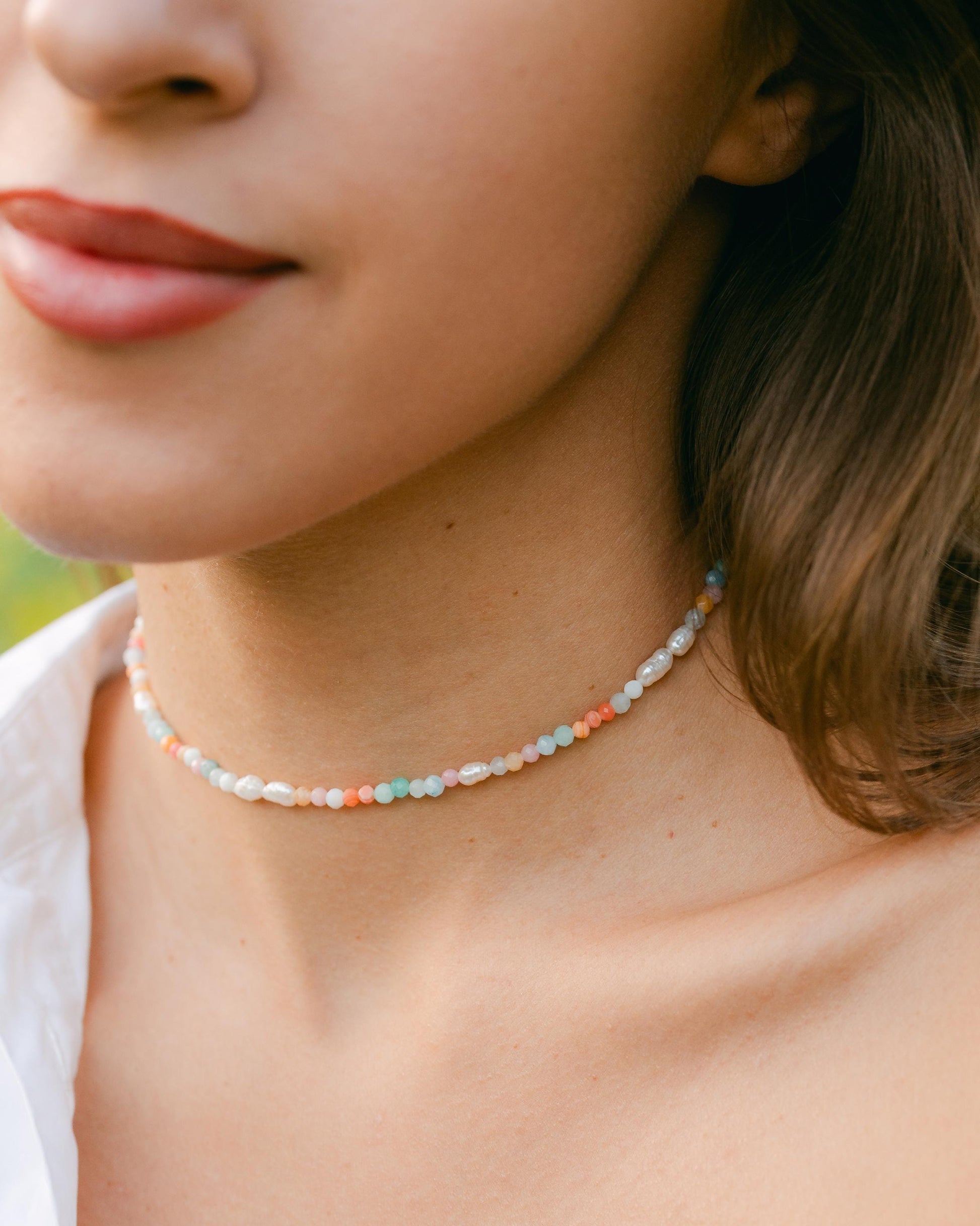 Dieser zarte Choker kombiniert die natürliche Schönheit von Süßwasserperlen mit einer farbenfrohen Auswahl echter Edelsteine. Die sommerliche Palette aus Türkis, Koralle, Hellblau, Rosa, Orange und Creme sorgt sofort für gute Laune, ganz gleich, wie der Tag beginnt. Zwischen den zart schimmernden Perlen finden sich pfirsichfarbener Sonnenstein, aquamarinblaue Akzente, mintgrüner Amazonit und rosafarbener Opal. Die Kette strahlt Leichtigkeit und Urlaubsgefühl aus, wie ein Tag am Meer. Die kleinen Edelsteinperlen sind 2–3 mm groß und facettiert. Die Süßwasserperlen sind etwas größer und natürlich geformt. Jede Perle wurde sorgfältig von Hand ausgewählt. Der hochwertige Verschluss aus Edelstahl ist langlebig, hautfreundlich und verstellbar um 5 cm.