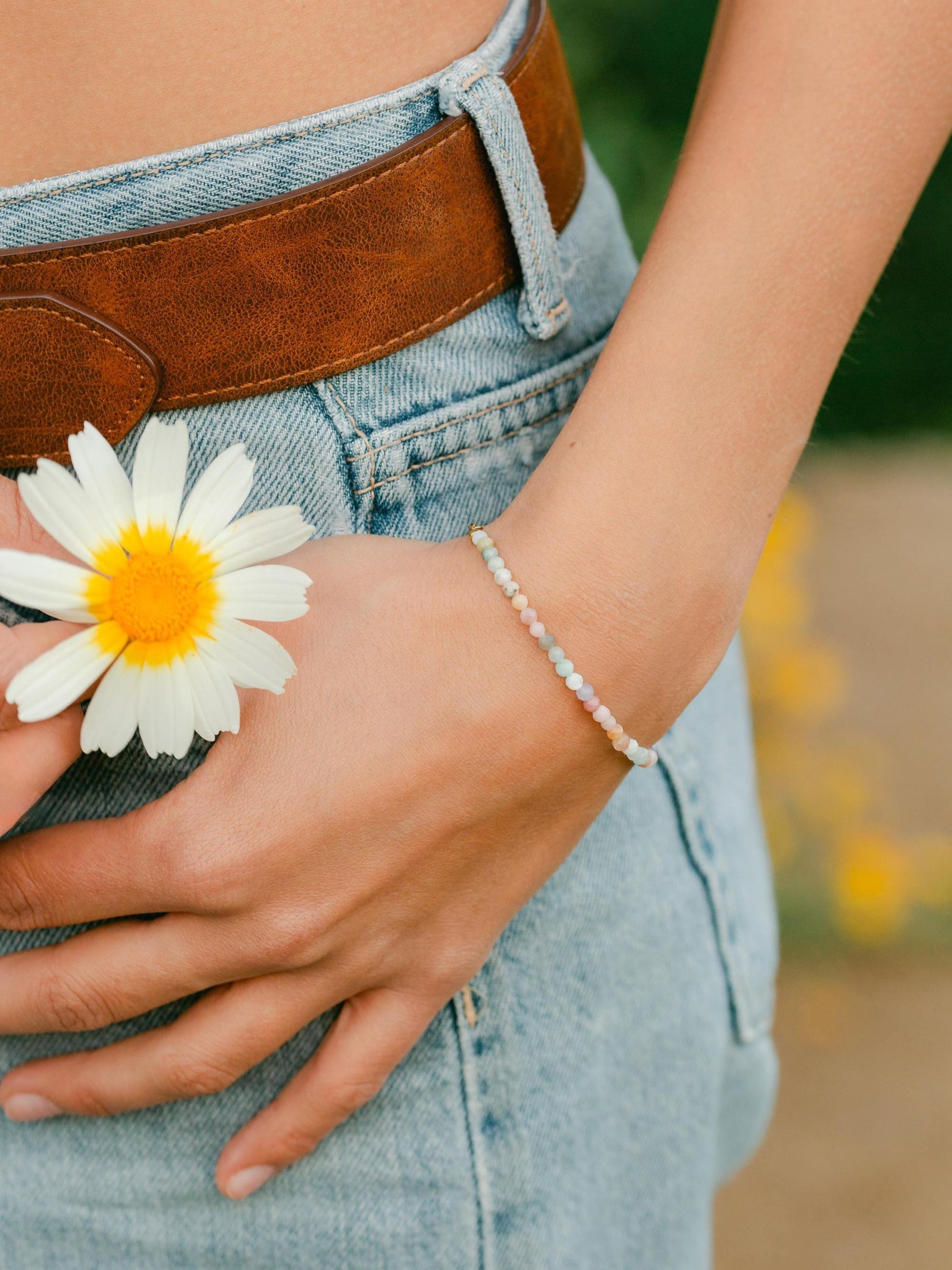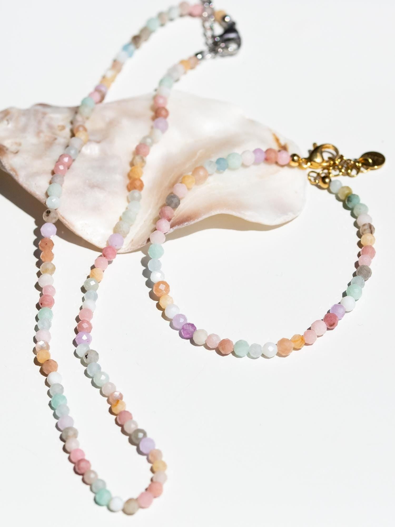 Diese bunte Perlenkette aus echten Edelsteinen bringt mit ihrer sanft schimmernden Pastellpalette garantiert gute Laune in deinen Look. Über 15 verschiedene, mit viel Sorgfalt ausgewählte Edelsteine vereinen sich in dieser filigranen Kette zu einem harmonischen Farbspiel – von pfirsichfarbenem Sonnenstein über zarten Aquamarin bis hin zu mintgrünem Amazonit. Ein echter Hingucker, der die Blicke auf sich zieht! Die facettierten Edelsteinperlen sind circa 2–3 mm groß und funkeln dezent im Licht. Der hochwertige Edelstahlverschluss ist langlebig, hautfreundlich und farbbeständig. Zudem lässt sich die Länge der Kette um 5 cm individuell anpassen.